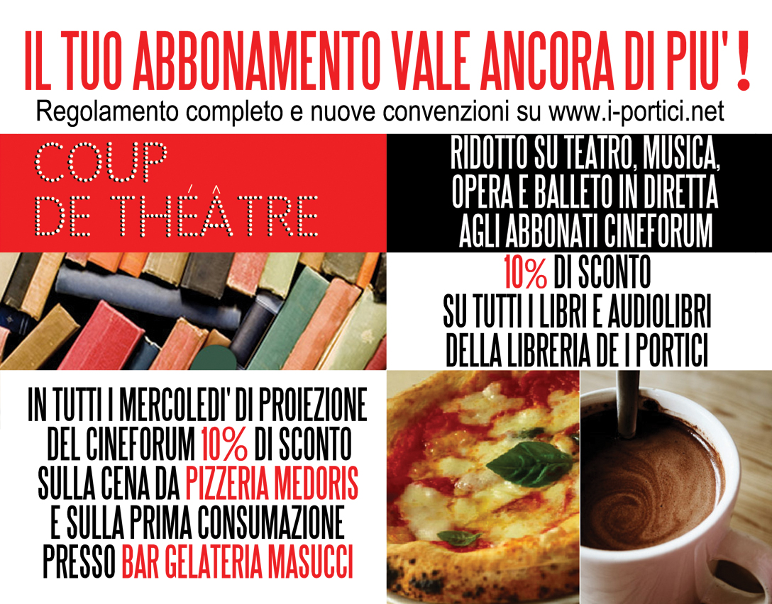 Da quest’anno, abbonarsi al Cineforum de I Portici conviene ancora di più! Abbonarsi permette di entrare a pieno titolo nei sostenitori delle nostre attività e quindi beneficiare di numerosi sconti e riduzioni.