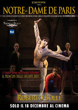 Roberto Bolle torna in sala con “Notre-Dame de Paris” di Maurice Jarre dal Teatro alla Scala di Milano. SOlo in questa data sarà possibile assistere in live HD allo spettacolo che, coniugando pratiche artistiche d’autore ad eccezionali divismi, aveva fatto innamorare il pubblico italiano lo scorso San Valentino. E’ il trionfo dell’idea di spettacolo secondo il coreografo Roland Petit come creazione totale: danza, scene, costumi, musica, teatralità. Esmeralda, Quasimodo, Frollo e Phoebus perni di una vicenda dalle forti tinte drammatiche e passionali. Diretto da Paul Connelly e con le scenografie di René Allio. A Natale torna sul Grande Schermo un Roberto Bolle indimenticabile, campione d’incassi della scorsa stagione.